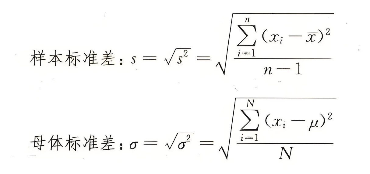 当拥有全部数据(总体)时,例如某班级50名学生的全部考试成绩、某公司100名员工的全部薪资数据,此时计算的是"总体标准差",分母使用数据总个数"n"。